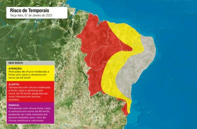 MARANHÃO – A região Nordeste do Brasil enfrenta um cenário de chuva intensa nos próximos dias, com acumulados que poderão superar a média climatológica de janeiro em várias localidades. Como mostra o mapa, nesta terça-feira (7), boa parte da região tem previsão de chuva. Maranhão, Piauí, sul do Ceará e oeste da Bahia ficam em alerta para temporais. Para áreas em amarelo, a chuva chega com moderada a forte intensidade.